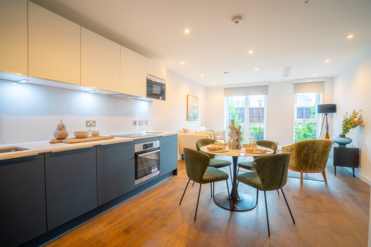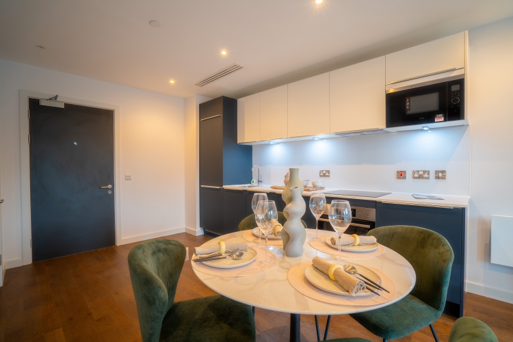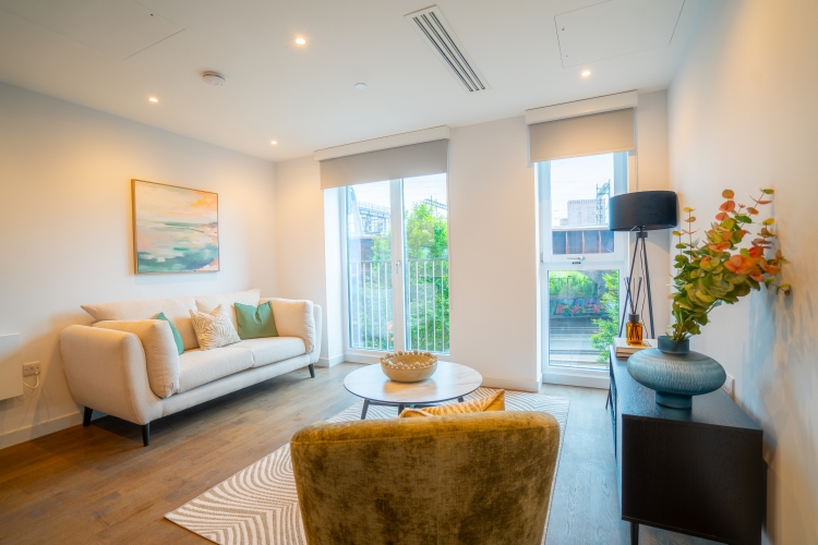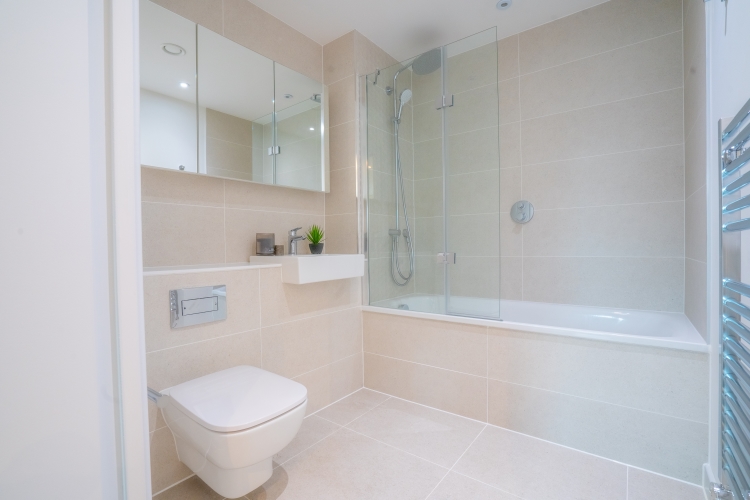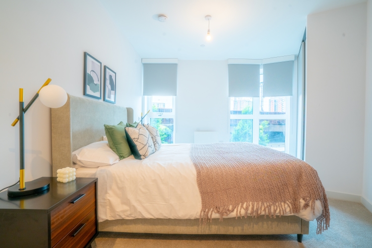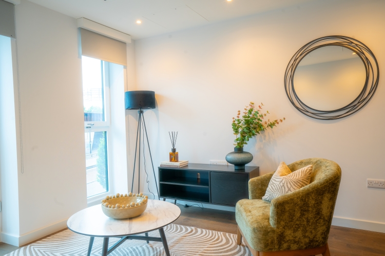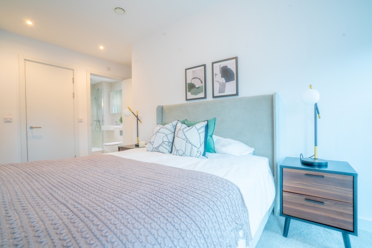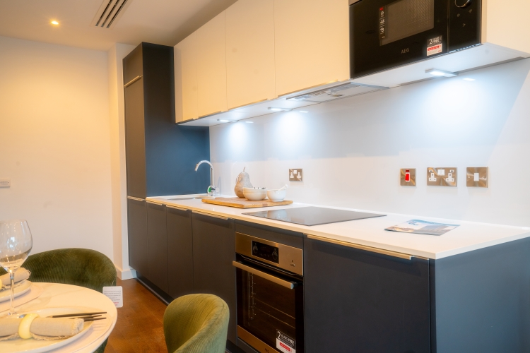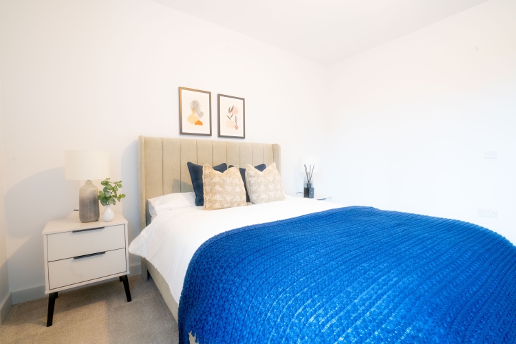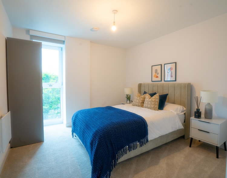 This First floor apartment comprises of an open-plan living and kitchen area and Juliet balcony. Integrated top of the range AEG/Zanussi appliances and stylish quartz worktops. The master bedroom benefits from a double fitted wardrobe, storage cupboard and En suite bathroom and luxury grey carpets. The bathroom is furnished with Hansgrohe taps and double rainfall shower over bath. All windows throughout the apartment feature Decor 350 blackout roller blinds.