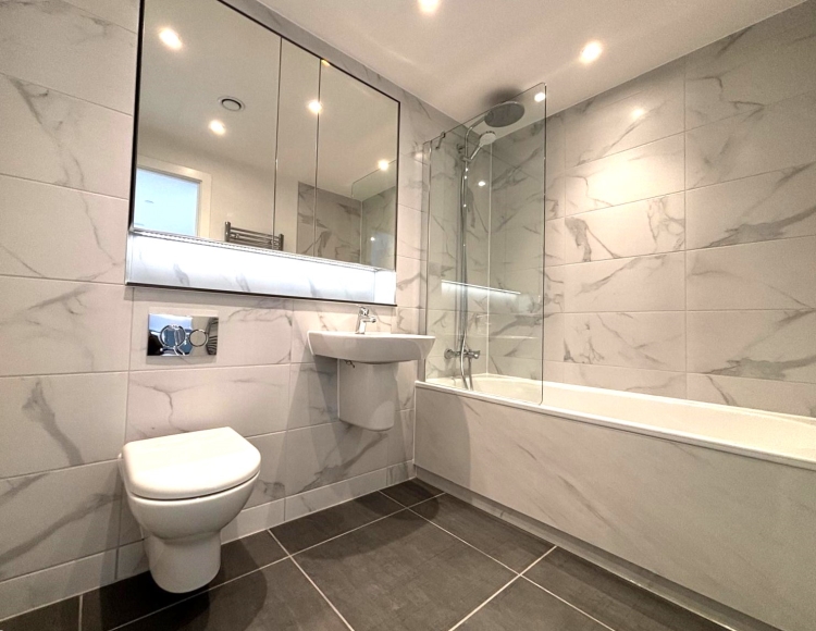 The spacious double bedroom includes built-in wardrobes, and the modern bathroom boasts elegant fittings and a walk-in shower.